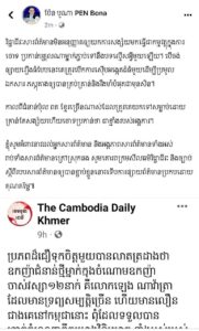 (ភ្នំពេញ)៖ លោក ប៉ែន បូណា រដ្ឋលេខាធិការ ក្រសួងព័ត៌មាន និងជាអ្នកកាសែតជើងចាស់ ដែលទើបត្រូវបានរដ្ឋមន្ត្រីក្រសួងព័ត៌មាន ចាត់តាំងឱ្យទទួលបន្ទុកការងារសម្របសម្រួល ពង្រឹងប្រសិទ្ធភាពវិជ្ជាជីវៈសារព័ត៌មាននោះ នៅព្រឹកថ្ងៃទី៨ ខែកុម្ភៈ ឆ្នាំ២០២៣នេះ បានបង្ហោះសារភ្ជាប់ជាមួយរូបភាពខ្លឹមសារព័ត៌មាន របស់សារព័ត៌មានក្រៅស្រុក The Cambodia Daily ដែលប្រើប្រាស់ត្រឹមតែការសង្ស័យ ធ្វើការចោទប្រកាន់លើអ្នកឧកញ៉ា ឡេង ណាវ៉ាត្រា ថាកំពុងធ្វើសកម្មភាពអាជីវកម្មភ្ជាប់ការលាងលុយ។