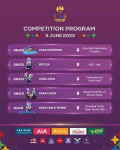 កីឡា ៖ កម្មវិធីប្រកួតសម្រាប់ថ្ងៃទី០៥ ខែមិថុនា ឆ្នាំ២០២៣ នៃព្រឹត្តិការណ៍កីឡាអាស៊ានប៉ារ៉ាហ្គេម លើកទី១២ គឺមានចំនួន ១៤ប្រភេទកីឡាត្រូវប្រកួតប្រជែងដែលមានដូចខាងក្រោមនេះ៖