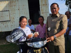 ព្រៃវែង៖ នៅព្រឹកថ្ងៃស្រុកទី ១ ខែវិច្ឆិកា ឆ្នាំ២០២៣ ឯកឧត្តម ឧកញ៉ា ជឹម សុខ ប្រធានសភាពាណិជ្ជកម្មខេត្តព្រៃវែង និង លោកជំទាវ សំ ចន្ថា រួមនឹងលោក ជឹម រតនៈ បានផ្តល់ឧបត្ថម្ភម៉ូតូ ហុងដា សេរីថ្មី ១គ្រឿង នឹងថវិការ ១លានរៀល ជូនដល់យុវតី សាំ ស្រីថន សិស្សប្រឡងជាប់និទ្ទេសA ដែលជាក្មេងកំព្រាឪពុក តស៊ូរៀនសូត្ររហូតក្លាយជាសិស្សពូកែ។