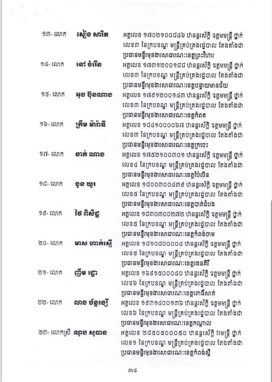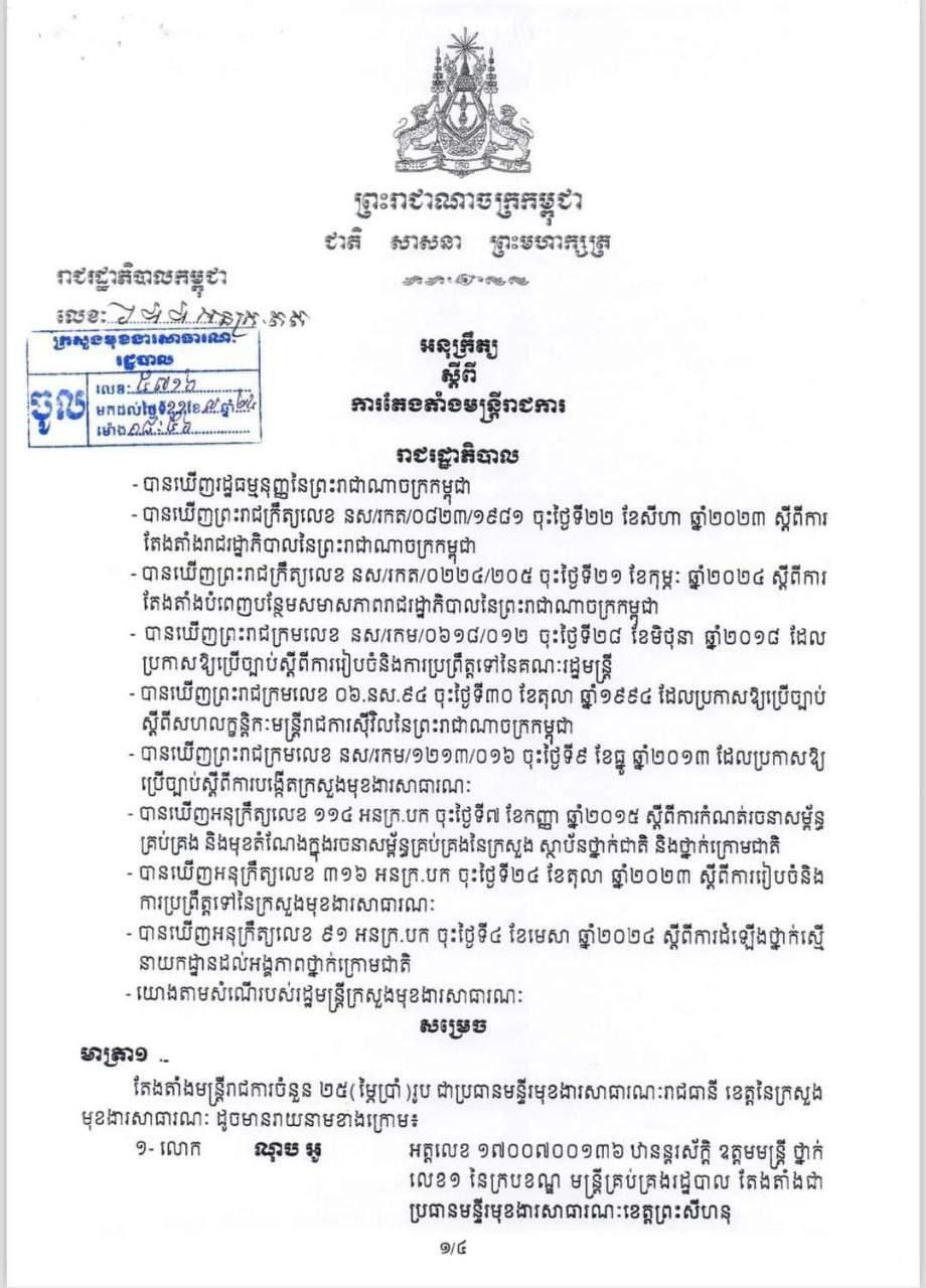 (ភ្នំពេញ)៖ សម្ដេចមហាបវរធិបតី ហ៊ុន ម៉ាណែត នាយករដ្ឋមន្ត្រីនៃកម្ពុជា បានចេញអនុក្រឹត្យតែងតាំងមន្ត្រីរាជការចំនួន២៥រូប ជាប្រធានមន្ទីរមុខងារសាធារណៈរាជធានី-ខេត្តទាំង២៥ នៃក្រសួងមុខងារសាធារណៈ៕