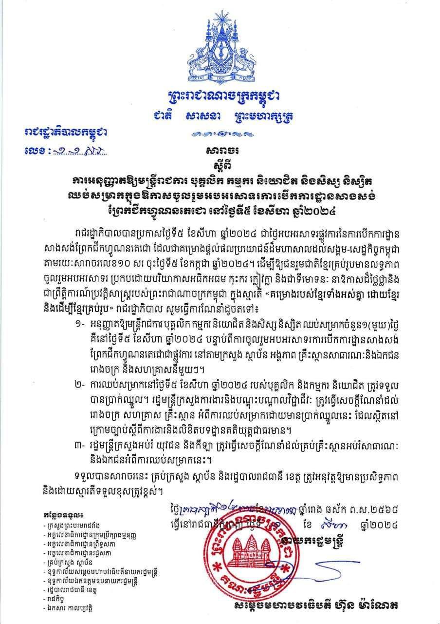 ១- អនុញ្ញាតឱ្យមន្ត្រីរាជការ បុគ្គលិក កម្មករ និយោជិត និងសិស្ស និស្សិត ឈប់សម្រាកចំនួន១(មួយ) ថ្ងៃ គឺនៅថ្ងៃទី៥ ខែសីហា ឆ្នាំ២០២៤។ បន្ទាប់ពីការចូលរួមអបអរសាទរការបើកការដ្ឋានសាងសង់ ព្រែកជីកហ្វូណនតេជោ ជាផ្លូវការ នៅតាមក្រសួង ស្ថាប័ន អង្គភាព គ្រឹះស្ថានសាធារណៈនិងឯកជន រោងចក្រ និងសហគ្រាសនីមួយៗ។
