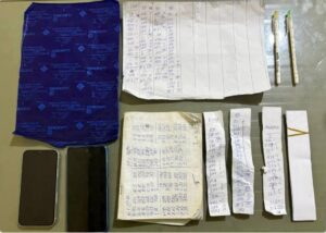 ជាក់ស្តែង ក្នុងប្រតិបត្តិការណ៍នេះអសមត្ថកិច្ចបានដកហូតវត្ថុតាងរួមមាន ៖ ទូរស័ព្ទដៃចំនួន០២គ្រឿង ម៉ាក iphone12 ពណ៌ស និងម៉ាក Tecno ពណ៌ទឹកសមុទ្រ , ក្រដាសA4 កាត់រួចមិនទាន់កត់លេខឆ្នោតចំនួន១៣សន្លឹក , ក្រដាសA4 កាត់រួចមានលេខកត់លេខឆ្នោតចំនួន០៣សន្លឹក , ក្រដាស A4 កត់លេខឆ្នោតរួចចំនួន០១សន្លឹក , សៀវភៅកត់លេខឆ្នោតចំនួន០១ក្បាល , ក្រដាសកាហ្គែ(ផ្ដាន) ០១សន្លឹក ,ប៊ិកចំនួន០២ដើម ។