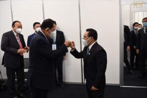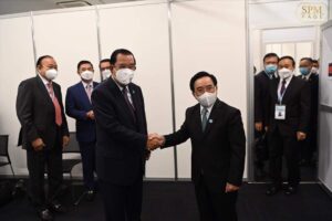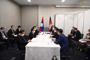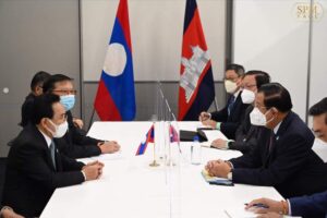 នៅទីក្រុងកូម៉ាម៉ូតូ ប្រទេសជប៉ុន នាព្រឹកថ្ងៃទី២៣ ខែមេសា ឆ្នាំ២០២២នេះ សម្ដេចអគ្គមហាសេនាបតីតេជោ ហ៊ុន សែន នាយករដ្ឋមន្ត្រីនៃព្រះរាជាណាចក្រកម្ពុជា បានទទួលជួបពិភាក្សាការងារជាមួយ ឯកឧត្ដម ផនខាំ វីផាវ៉ាន់ (Phankham Viphavanh) នាយករដ្ឋមន្ត្រីនៃសាធារណរដ្ឋប្រជាធិបតេយ្យប្រជាមានិតឡាវ នៅមុនកិច្ចប្រជុំកំពូលស្ដីអំពីបញ្ហាទឹកតំបន់អាស៊ីប៉ាស៊ីហ្វិកលើកទី៤។