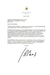 ខ្ញុំមានសេចក្តីសោមនស្សរីករាយសូមអញ្ជើញ សម្តេចតេជោនាយករដ្ឋមន្ត្រី ចូលរួមដោយផ្ទាល់ក្នុង កិច្ចប្រជុំកំពូលពិសេសអាស៊ាន-សហរដ្ឋអាមេរិក នៅរដ្ឋធានីវ៉ាស៊ីនតោន នៅថ្ងៃទី១២-១៣ ខែឧសភា ឆ្នាំ ២០២២។ ក្នុងឱកាសកិច្ចប្រជុំកំពូលនោះ យើងនឹងប្រារព្ធខួបអនុស្សាវរីយ៍លើកទី៤៥ នៃភាពជាដៃគូយូរ អង្វែង និងលើកឡើងអំពីមហិច្ឆតារួមរបស់យើង សម្រាប់សករាជថ្មីនៃទំនាក់ទំនងដៃគូសន្ទនាអាស៊ាន សហរដ្ឋអាមេរិក។ ខ្ញុំទន្ទឹងរង់ចាំជួប សម្តេចតេជោនាយករដ្ឋមន្ត្រី និងថ្នាក់ដឹកនាំអាស៊ានដទៃទៀត នៅ សេតវិមាន។