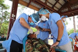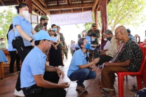 (ព្រះវិហារ-ស្វាយរៀង) ៖ នៅព្រឹកថ្ងៃអាទិត្យទី១៥ ខែឧសភាឆ្នាំ២០២២ លោកជំទាវ ហ៊ុន ម៉ាណា អគ្គនាយការវិទ្យុ និងទូរទស្សន៍បាយ័ន និងជាប្រធានក្រុមវេជ្ជសាស្ត្រសម្ដេចតេជោ បានអញ្ជើញដឹកនាំក្រុមគ្រូពេទ្យស្ម័គ្រចិត្តចុះពិនិត្យ ព្យាបាលជំងឺជូនកងទ័ព, គ្រួសារកងទ័ព និងប្រជាពលរដ្ឋ សរុបចំនួន១៧៦៩នាក់។ ពិធីនេះធ្វើឡើងនៅបរិវេនកងពលតូចអន្តរាគមន៍លេខ៧ ក្នុងភូមិសែនជ័យ ឃុំស្រអែម ស្រុកជាំក្សាន្ត ខេត្តព្រះវិហារ។ ពិធីនេះ ក៏មានការអញ្ជើញចូលរួមពីសំណាក់ ឯកឧត្តម ស្រី ឌឹក មេបញ្ជាការកងទ័ពជើងគោក និងជាមេបញ្ជាការធំកងអន្តរាគមន៍លេខ៣,ឯកឧត្តម សួស យ៉ារ៉ា អ្នកតំណាងរាស្រ្តមណ្ឌលព្រះវិហារ និងលោកជំទាវ ប៉ាង រ៉ាវី អភិបាលរងខេត្តព្រះវិហារ ។ លោកជំទាវ ហ៊ុន ម៉ាណា ប្រធានក្រុមវេជ្ជសាស្រ្តសម្តេចតេជោ បានមានប្រសាសន៍សំណេះសំណាល និងពាំនាំនូវការផ្តាំផ្ញើសាកសួរសុខទុក្ខពីសំណាក់ សម្តេចតេជោ ហ៊ុន សែន និងសម្តេចកិត្តិព្រឹទ្ធបណ្ឌិត ប៊ុន រ៉ានី ហ៊ុនសែន ជូនបងប្អូនប្រជាពលរដ្ឋដែលបានចូលរួម។ លោកជំទាវមានប្រសាសន៍ថា សម្តេចទាំង២ តែងតែគិតគូរយកចិត្តទុកដាក់ដល់ប្រជាពលរដ្ឋគ្រប់ទីកន្លែង និងគ្រប់ពេលវេលា។ លោកជំទាវបានថ្លែងអំណរគុណអាជ្ញាធរគ្រប់លំដាប់ថ្នាក់នៃស្រុកជាំក្សាន្ត ដែលបានសម្របសម្រួលដល់បងប្អូនប្រជាពលរដ្ឋឱ្យបានអញ្ជើញមកដល់ទីតាំងពិនិត្យ ពិគ្រោះ និងព្យាបាលជំងឺដោយឥតគិតថ្លៃនេះ។