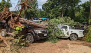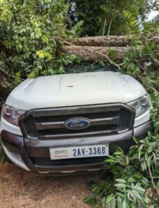 បណ្តាលឱ្យខូចខាតយ៉ាងធ្ងន់ធ្ងរ ខណៈពេលមានភ្លៀងធ្លាក់ជាប់ៗគ្នា ព្រមទាំងមានផ្គររន្ទះបាញ់ផងដែរ ធ្វើឱ្យរលើងឫសរលំសង្កត់លើរថយន្តតែម្តង។
