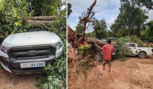 ភ្លៀងធ្លាក់ជាប់ៗគ្នាដើមឈើរលំលើរថយន្តស៊េរីទំនើប៣គ្រឿង នៅចំណតទឹកជ្រោះភ្នំគូលែន!