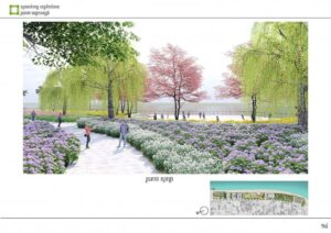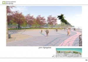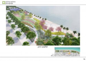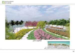 តាមគម្រោងប្លង់ ដែលគ្រោងអភិវឌ្ឍសួនច្បារមាត់ទន្លេ ក្នុងក្រុងកំពង់ចាមនោះមានដូចជា ៖ កន្លែងអាហារដ្ឋានលើទឹក, បឹងហ្គាឡូ និងអាហារដ្ឋាន , ក្លឹបហាត់ប្រាណ, ផាប់, សួនច្បារ, សួនកុមារ, កន្លែងថតរូប , កន្លែងភិចនិច នឹងកញ្ចុះអង្គុយលេង, ផ្សារអាហារ ជាដើម។