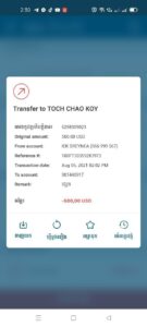 ចំពោះលេខកុង ABA របស់លោក ដែលទទួលប្រាក់ចំនួន៥០០$ រួមនិងក្រដាស(វីង)ទទួលលុយនោះ។