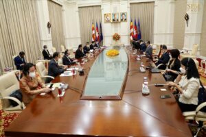 នៅវិមានសន្តិភាព នារសៀលថ្ងៃទី០៣ ខែសីហា ឆ្នាំ២០២២នេះ សម្ដេចអគ្គមហាសេនាបតីតេជោ ហ៊ុន សែន នាយករដ្ឋមន្ត្រី នៃព្រះរាជាណាចក្រកម្ពុជា បានទទួលជួបពិភាក្សាការងារជាមួយឯកឧត្តម វ៉ាង យី (Wang Yi ) ទីប្រឹក្សារដ្ឋ និងជារដ្ឋមន្ត្រីការបរទេស នៃសាធារណរដ្ឋប្រជាមានិតចិន ក្នុងឱកាសដែល ឯកឧត្តម បានដឹកនាំគណៈប្រតិភូ អញ្ជើញបំពេញទស្សនកិច្ចផ្លូវការ និងអញ្ជើញចូលក្នុងកិច្ចប្រជុំកំពូលរដ្ឋមន្ត្រីការបរទេសអាស៊ានលើកទី៥៥ និងកិច្ចប្រជុំពាក់ព័ន្ធ ដែលកម្ពុជាធ្វើជាម្ចាស់ផ្ទះ។