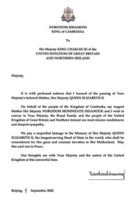ព្រះចៅក្រុងកម្ពុជា មានព្រះទូលទៀតថា ក្នុងនាមប្រជាជនខ្មែរ សម្តេចព្រះមហាក្សត្រី នរោត្តម មុនិនាថ សីហនុ ព្រះវរាជមាតាជាតិខ្មែរ និងព្រះអង្គផ្ទាល់ សូមចូលរំលែកទុក្ខយ៉ាងស្មោះ និងសូមសម្តែងសមានចិត្តយ៉ាងជ្រាលជ្រៅជាមួយរាជវង្សានុវង្សនៃចក្រ និងប្រជាជននៃចក្រភពអង់គ្លេស ចំពោះការសោយព្រះពិលាល័យរបស់ព្រះមហាក្សត្រី អេលីហ្សាបេតទី២។ ព្រះអង្គ បន្តថា សតិអារម្មណ៍របស់ព្រះអង្គ និងប្រជាជនខ្មែរ ស្ថិតនៅជាមួយព្រះមហាក្សត្រ ឆាលទី៣ និងប្រជាជាតិចក្រភពអង់គ្លេស ក្នុងឱកាសដ៏ក្រៀមក្រំនេះ។