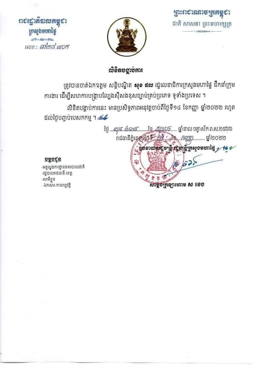 នៅក្នុងលិខិតបង្គាប់ការនោះបានបញ្ជាក់ថា ត្រូវបានចាត់ ឯកឧត្តម សន្ដិបណ្ឌិត សុខ ផល រដ្ឋលេខាធិការក្រសួងមហាផ្ទៃ ដឹកនាំក្រុមការងារ ដើម្បីសហការបង្ក្រាបបទល្មើសល្បែងសុីសងគ្រប់ប្រភេទ ទូទាំងប្រទេស
