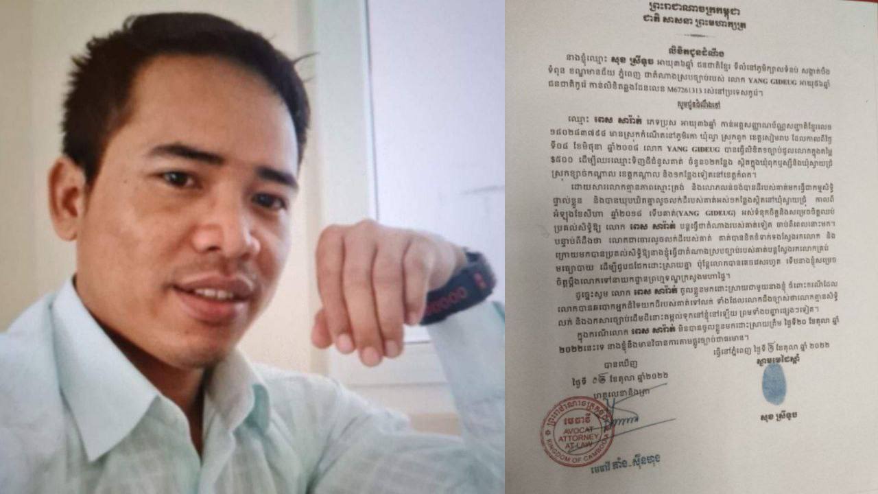 ខេត្តកណ្តាល៖ កាលពីថ្ងៃទី០៩ ខែតុលា ឆ្នាំ២០២២ ឈ្មោះ សុខ ស្រីទូច អាយុ៣៦ឆ្នាំ ជនជាតិខ្មែរ ទីលំនៅភូមិក្បាលទំនប់ សង្កាត់បឹងទំពុន ខណ្ឌមានជ័យ ភ្នំពេញ ជាតំណាងស្របច្បាប់របស់ លោក YANG GIDEUG ជនជាតិកូរ៉េ បានចេញលិខិតជូនដំណឹងមួយច្បាប់ ដែលមាន លោកស្រីមេធាវី តាំង ស៊ីនហុង បានប្រថាប់ត្រាដឹងលឺទៀតផង ដែលមានខ្លឹមសារថា៖