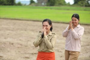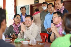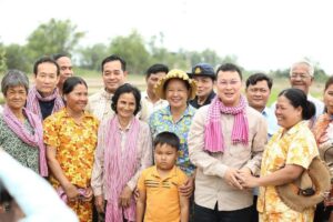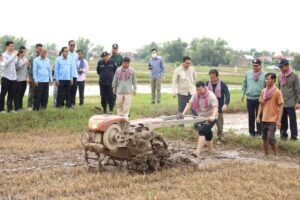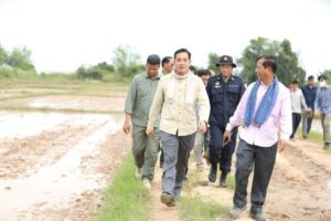 កំពង់ចាម៖ នៅព្រឹកថ្ងៃទី ២០ ខែ តុលា ឆ្នាំ២០២២ ឯកឧត្តម អ៊ុន ចាន់ដា អភិបាលនៃគណៈអភិបាលខេត្តកំពង់ចាម និងជាប្រធានគណៈកម្មាធិការគ្រប់គ្រងគ្រោះមហន្តរាយខេត្ត អមដំណើរឯកឧត្តម ឌិត ទីណា រដ្ឋមន្ត្រីក្រសួងកសិកម្ម រុក្ខាប្រមាញ់ និងនេសាទ និងឯកឧត្តម ឡាំង ហេងហួត រដ្ឋមន្ត្រីប្រតិភូអមនាយករដ្ឋមន្ត្រី និងជាអនុប្រធានគណៈកម្មាធិការជាតិគ្រប់គ្រងគ្រោះមហន្តរាយ តំណាងដ៏ខ្ពង់ខ្ពស់ ឯកឧត្តមគន់ គីម ទេសរដ្ឋមន្ត្រី ទទួលបន្ទុក បេសកកម្មពិសេស និងជាអនុប្រធានទី១គណៈកម្មាធិការជាតិគ្រប់គ្រងគ្រោះមហន្តរាយ អញ្ជើញចុះពិនិត្យការងារបង្កបង្កើនផលរបស់កសិករនៅឃុំខ្ពបតាងួន ស្រុកស្ទឹងត្រង់ បន្ទាប់ពីទទួលបានពូជស្រូវពីរាជរដ្ឋាភិបាលកម្ពុជាដើម្បីស្តារឡើងវិញក្រោយរងផលប៉ះពាល់ដោយទឹកជំនន់ទន្លេមេគង្គ និងជំនន់ទឹកភ្លៀង។
