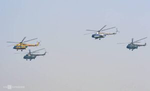 យន្តហោះចម្បាំង Su-30MK2 និងឧទ្ធម្ភាគចក្រ Mi បានធ្វើលំហាត់កាយសម្ព័ន្ធដែលជាផ្នែកមួយនៃសមយុទ្ធហោះហើរនៅទីក្រុងហាណូយកាលពីថ្ងៃព្រហស្បតិ៍ ដើម្បីត្រៀមខ្លួនសម្រាប់ពិព័រណ៍ការពារអន្តរជាតិវៀតណាមឆ្នាំ 2022។
