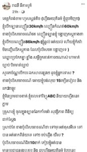 ខ្ញុំបើកបរល្បឿន86km/h (ខ្ញុំឆ្ងល់ អត់យល់ ហើយខ្ញុំក៏តវ៉ មិនជឿលើភស្តុតាង ដែលប៉ូលិសថតបង្ហាញទេ )ឈ្លោះប្រកែកគ្នា ខ្លាំង សម្តីពួកគាត់កាចៗណាស់ ហាមាត់ ច្បាប់ បិតមាត់ច្បាប់ សួររកប័ណ្ណបើកបរ ឯកសារផ្សេងៗ ដូចខ្ញុំអ្នកទោស ? ខាងប៉ូលិសចរាចរណ៍ អោយខ្ញុំបង់លុយ 15មឿនរៀល និង ខ្ញុំមិនព្រមដាចខាត់ ខ្ញុំខលទៅវិទ្យុABC និយាយរឿងនេះភ្លាមគ្រួសារខ្ញុំ ចូលក្នុងឡានឆែកកាំមេរ៉ា សុវត្ថិភាព ពិនិត្យ ជាក់ស្ដែង ស្រាប់តែ ខាងប៉ូលិសចរាចរណ៍ថា ទៅចុះ អត់ខុសអីទេទៅ បាន អត់ផាកពិន័យទេ ទៅៗ ចប់រឿង យីស?