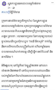 សូមបញ្ជាក់ផងដែរថា បច្ចុប្បន្ននេះសមត្ថកិច្ចជំនាញ បាននឹងកំពុងធ្វេីការស្រាវជ្រាវរកអត្តសញ្ញាណម្ចាស់គណនីហ្វេសប៊ុករូបនេះ ដេីម្បីកោះអញ្ជេីញមកធ្វេីការសាកសួរបំភ្លឺ ជុំវិញករណីដែលបានបង្ហោះក្នុងបណ្ដាញសង្គមលេីគណនីហ្វេសប៊ុករបស់គាត់ បេីរកឃេីញថា បុគ្គលម្ចាស់គណនីហ្វេសប៊ុកដែលមានឈ្មោះខាងលេីនោះបានប្រព្រឹត្តខុសហេីយចោទប្រកាន់មកលេីមន្រ្តីអនុវត្តច្បាប់ ដែលជាចេតនាទុច្ចរិត ធ្វេីឲ្យប៉ះពាល់ដល់កិត្តិយសយ៉ាងធ្ងន់ធ្ងរដល់មន្រ្តីនគរបាលជាតិ ពិសេសមន្ត្រីអនុវត្តច្បាប់ យេីងខ្ញុំនឹងអនុវត្តតាមនីតិវិធីច្បាប់ ៕