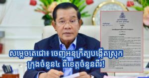 ព័ត៌មានជាតិ សម្តេចតេជោ៖ ចេញអនុក្រឹត្យបង្កើតស្រុកក្រុងចំនួន៤ ក្នុងខេត្តចំនួនពីរ! By chanry editor On Dec 24, 2022 0 Share សម្តេចតេជោ៖ ចេញអនុក្រឹត្យបង្កើតស្រុកក្រុងចំនួន៤ ក្នុងខេត្តចំនួនពីរ! 0 Share FacebookTwitterGoogle+ReddItWhatsAppPinterestEmail